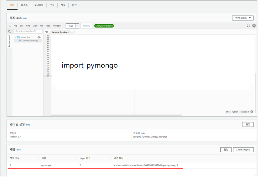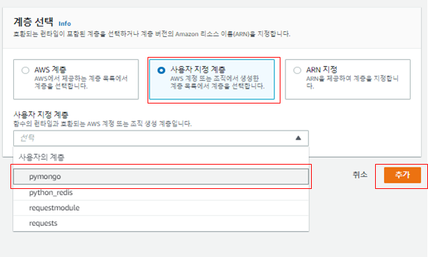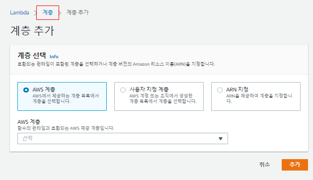 6. AWS Lamdba 작성 화면으로 이동한다. 그리고 아래 화면에서 Add a layer를 눌러준다