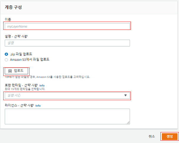 9. 이름과 [5번]에서 만든 압축 파일을 업로드 해준다. 그리고 호환 런타임에서 호환되는 라이브러리를 선택해 준다.